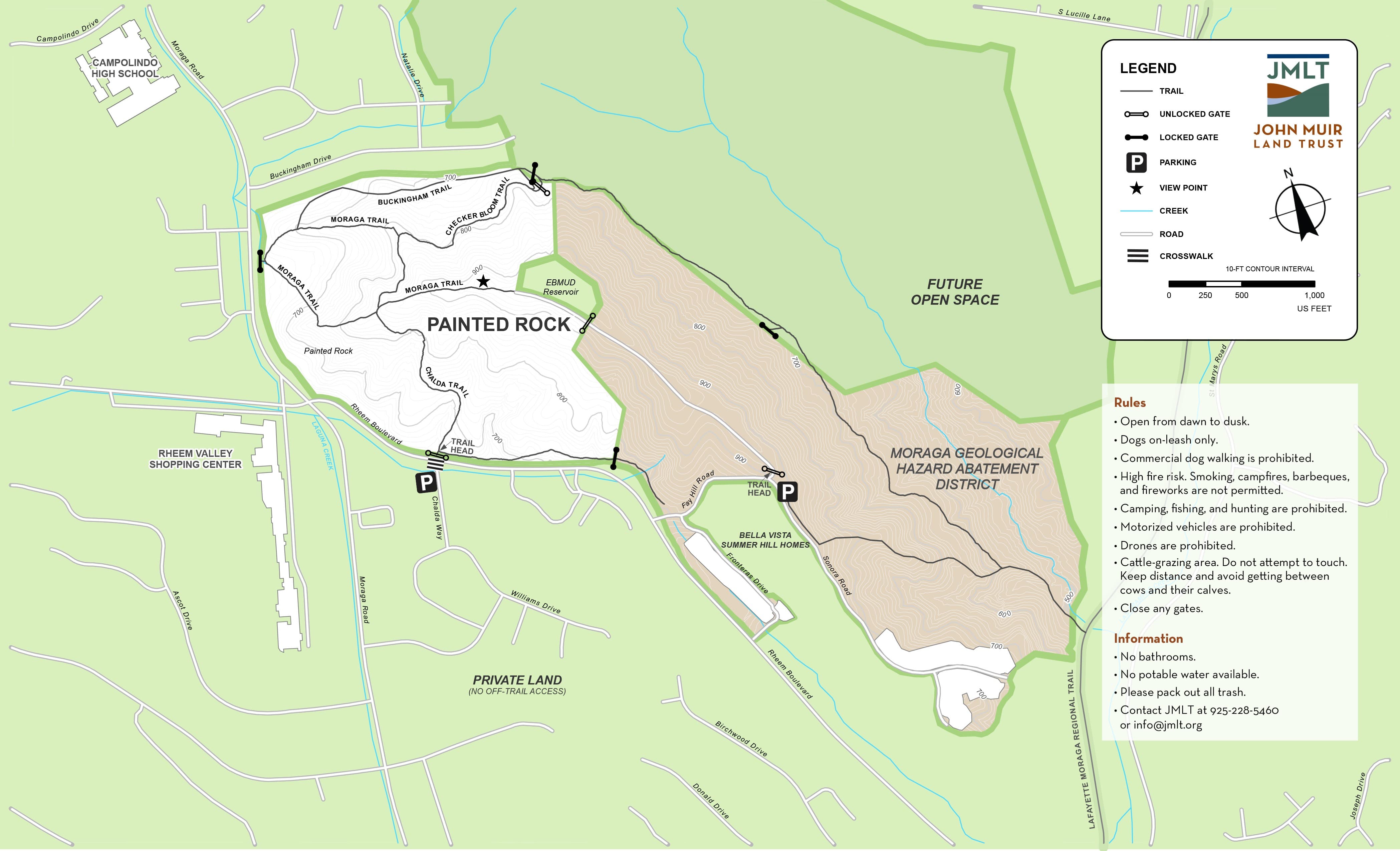 Painted Rock was once offered for sale as a development site for $15 million. Committed to conservation, the landowner generously offered the property to JMLT as an extraordinary one-time opportunity to shape the landscape we leave to future generations. Painted Rock is an important acquisition in The Moraga Hills Campaign, part of John Muir Land Trust’s decades-long effort to protect the most threatened properties in the East Bay Hills. This landscape defines our region’s rich natural heritage. The campaign will protect hundreds of acres in Lamorinda that protect native species, preserve clean drinking water, and offer residents spectacular opportunities to experience wide-open natural spaces just minutes from home.
